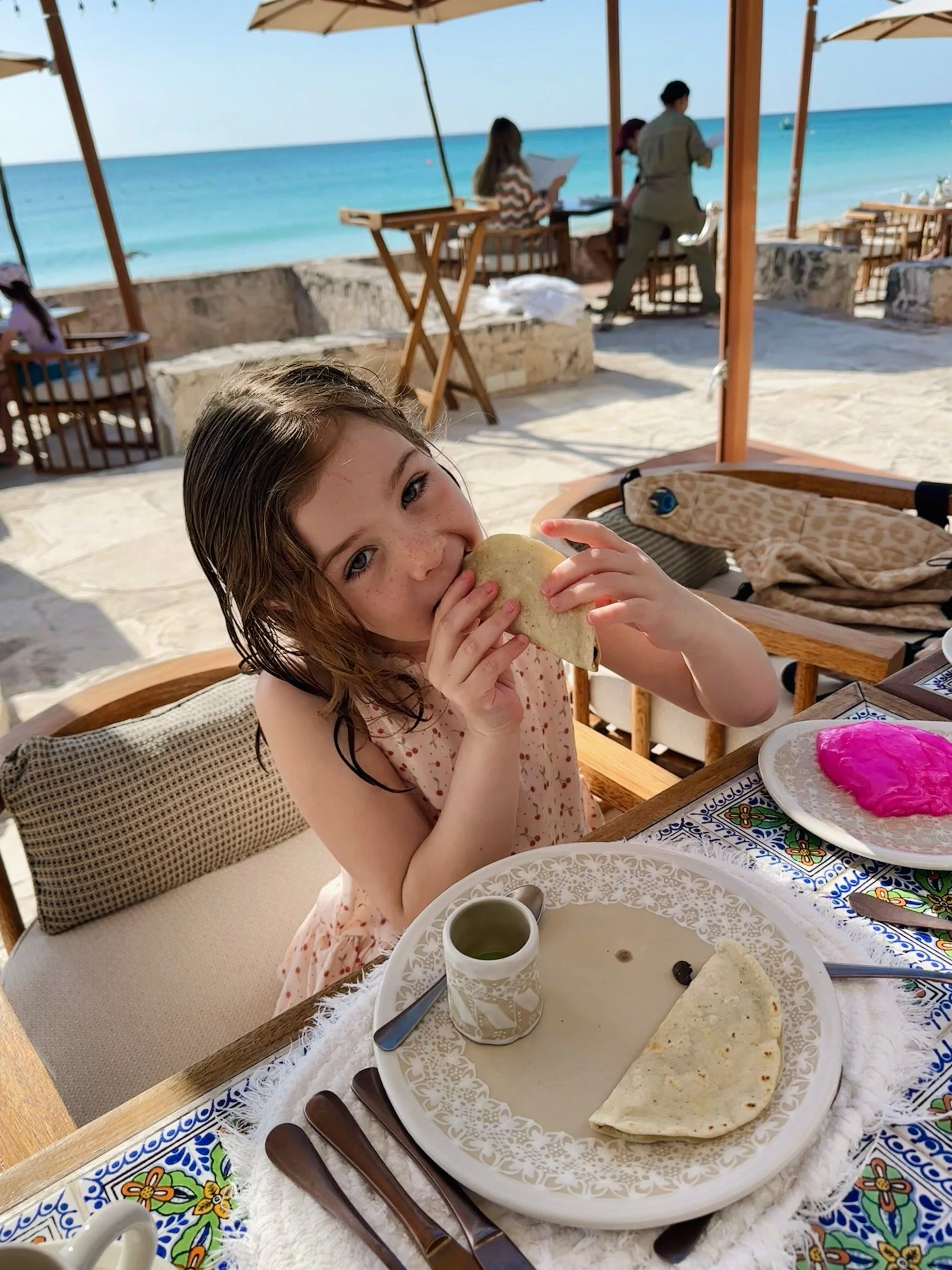 Julia savoring a fresh handmade mushroom quesadilla, lovingly prepared by Tía Olivia, at Belmond Maroma, with the sea stretching out just beyond us.